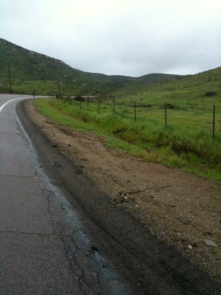 The next leg of the ride broke into the countryside. I had been told that the course would take us into both mountains and desert, but all I saw was green soaked rolling hills leading up to our climb into the mountains. The signature of this section was tall, healthy grass, oak trees in the lower lands, and swollen streams rushing down the nooks and crannies of the hillside.